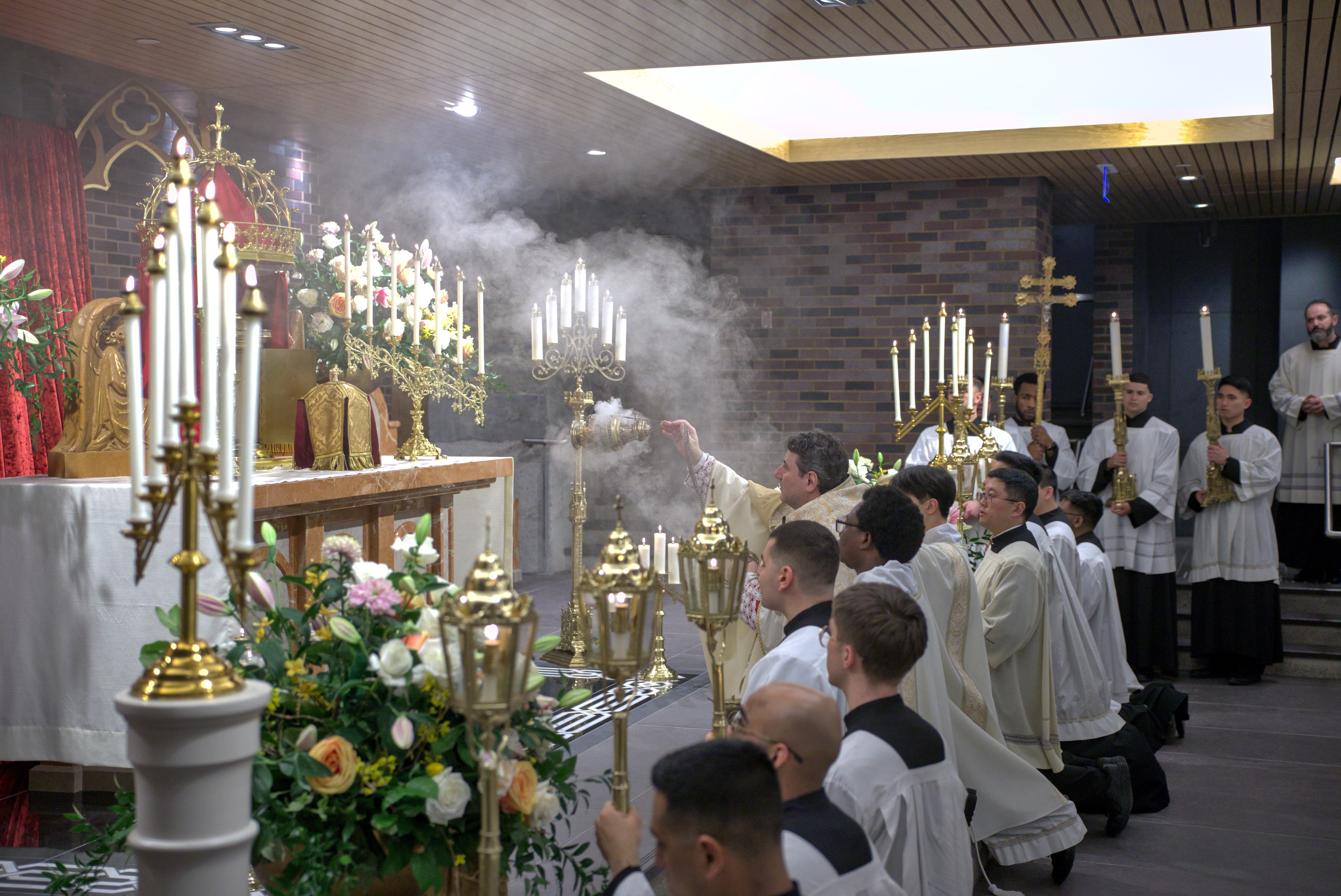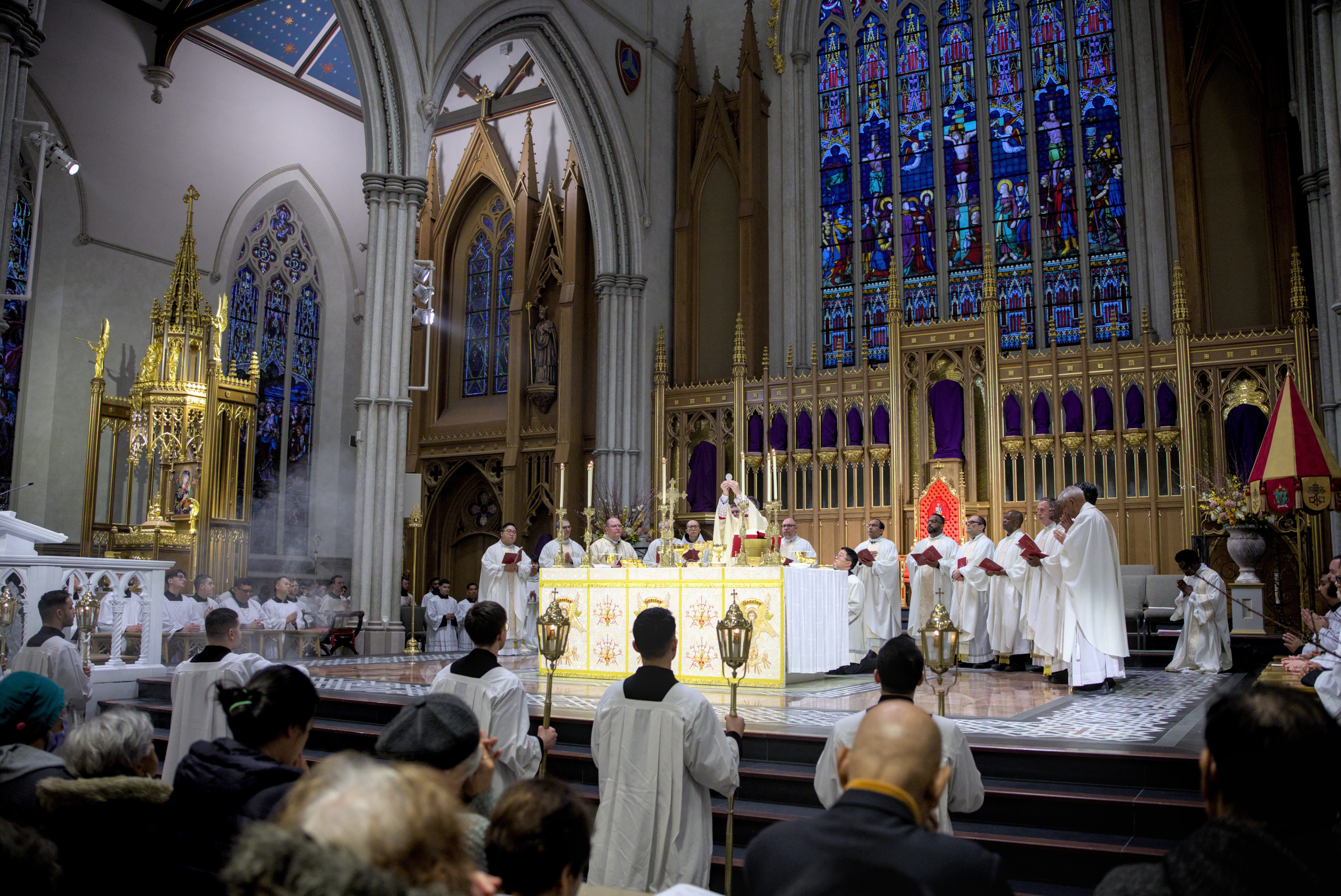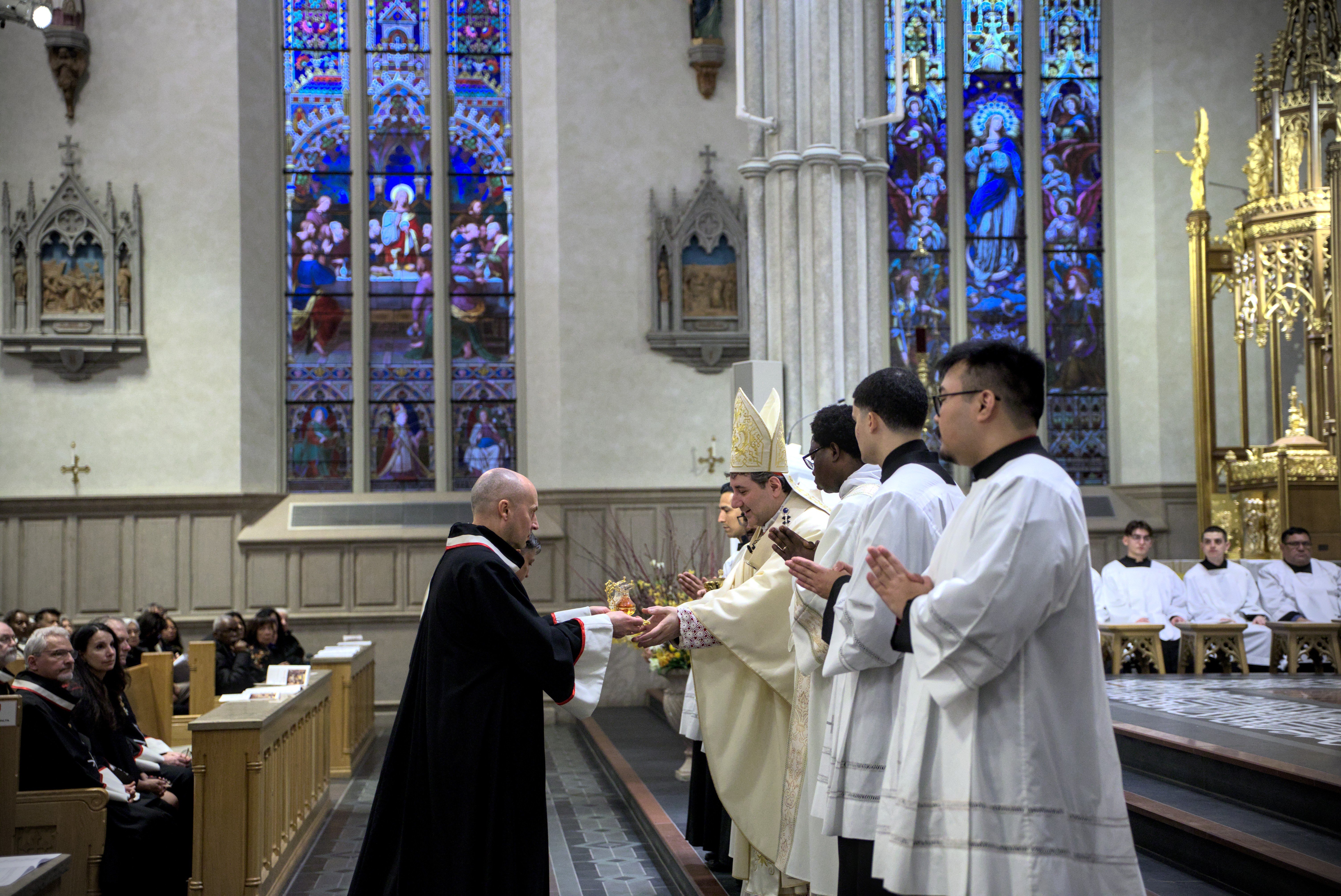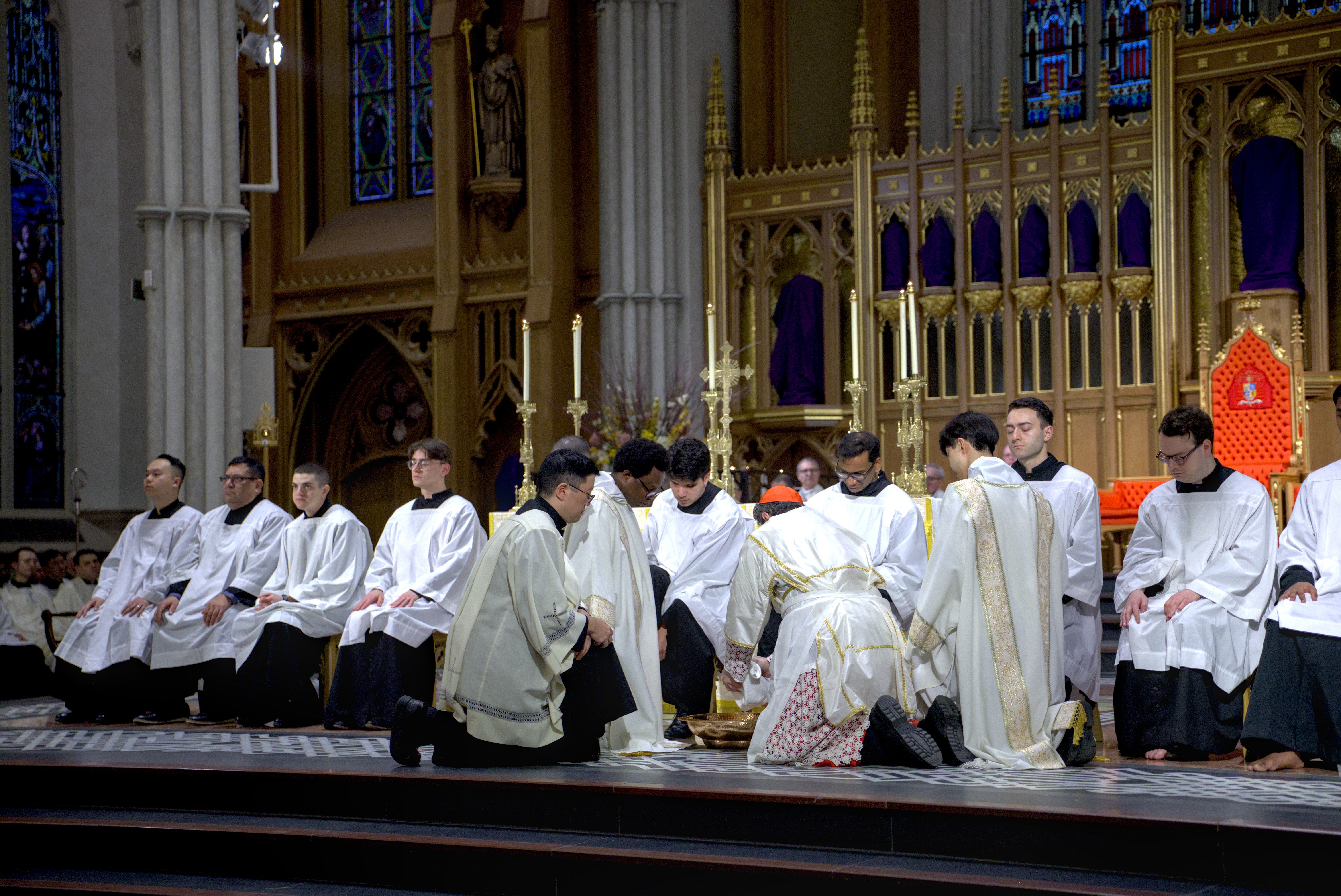 At St. Michael’s Cathedral Basilica, His Eminence Frank Cardinal Leo presided at the 5:30 p.m. Mass. As part of the Holy Thursday Mass, Cardinal Leo washed the feet of 12 seminarians currently in formation for the priesthood. This is done as a sign of humility, unity and love, following the example of Jesus who washed the feet of his disciples.